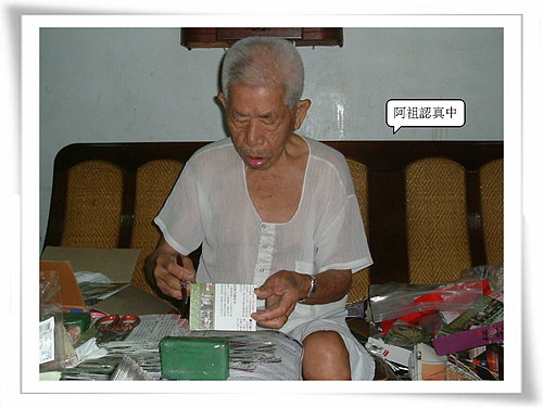 對了,阿祖還有一件生活事忘了介紹看看底下這張照片阿祖正在認真的工作中阿祖每天除了散散步.弄弄花草以外就是每天必做的手工了阿祖的手工做的就是折紙垃圾盒阿祖堅持每一個折的大小要一樣就連相同花色也要放一起阿祖每到一個兒子那這些紙玩意就必須跟阿祖到哪裡阿祖最喜歡人家稱讚他紙垃圾盒折的好漂亮而且就會滔滔不絕的說是如何折的唷~