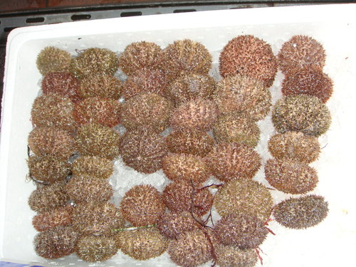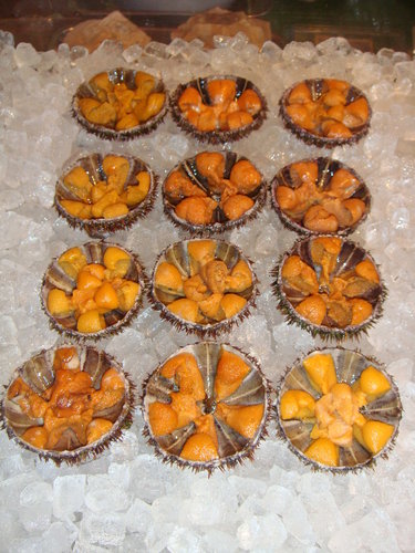 這樣就是旅遊書與朋友都說來朝市一定得吃的馬糞海膽說這的馬糞海膽非常的好吃,不吃會後悔下圖這是已經剖開的海膽