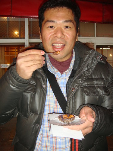 帥酷媽我對這味不太感興趣,帥酷爸可是躍躍欲試呢!所以喽!帥酷爸當然就不能錯過嚐鮮的好機會經過導遊建議要吃烤熟的比較好吃,又經帥酷爸嚐後說:歐依細最後帥酷媽也是嚐上了一口,嚐後結果還真的是蠻不錯的呢!甜甜滑嫩滑嫩的像是在吃布丁一般