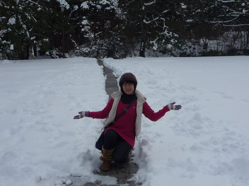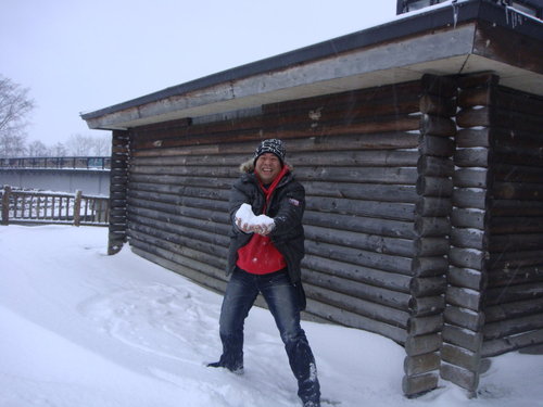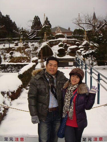 享用早餐後還有點時間才有驅車前往今天的第一各風景區於是我們當然就利用了這一點時間趕快來玩雪玩了一會兒天空又開始飄下了白雪,我們整個是開心極了