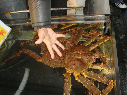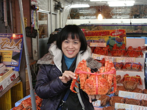 每一隻帝王蟹都像我們手上這樣的肥大喔!沒有嚐嚐帝王蟹的滋味跟老闆借隻來拍拍照,滿足一下喽!拍下照片一看才知帝王蟹都比我們的臉大了哩~