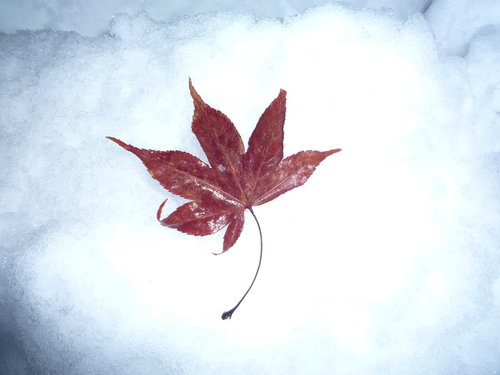 掉在雪地上的一片楓葉,拍起來的感覺來挺不賴的呢!