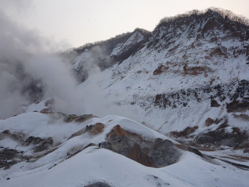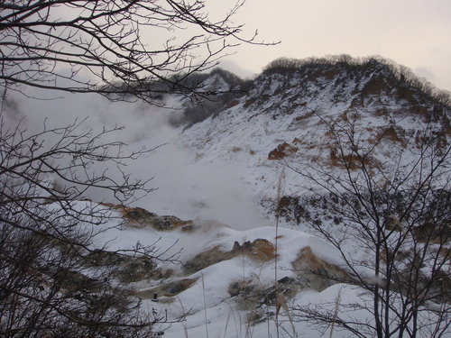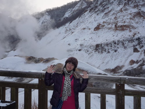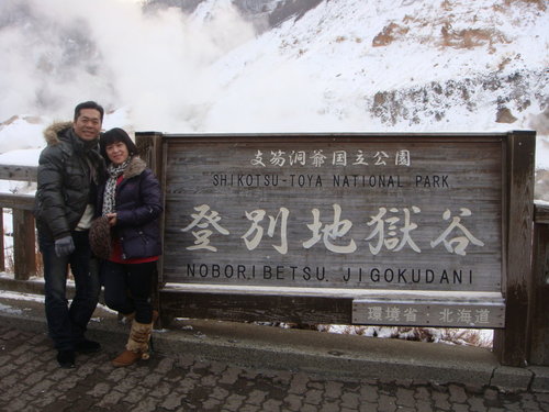 隨後來到登別地獄谷這是一座火山爆發後由融岩所形成的一個奇形詭異的谷地灰白和褐色的岩層加上許多地熱自地底噴出,形成特殊的火山地形景觀