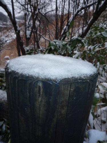 柱子上面的一層白雪,像不像是木頭長了一層厚厚的霉呢!