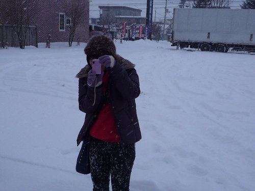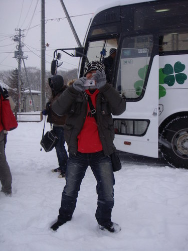 上車前天空又開始飄下白雪我們帥酷夫妻倆開心到拿著相機玩互拍