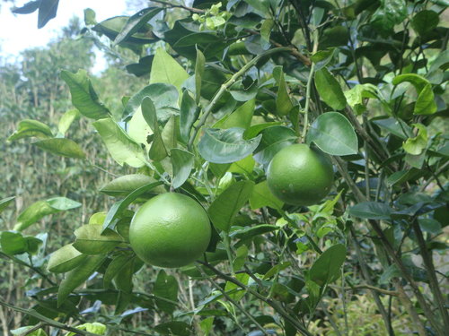 路邊一顆柚子樹,樹上調著兩顆尚未成熟的柚子