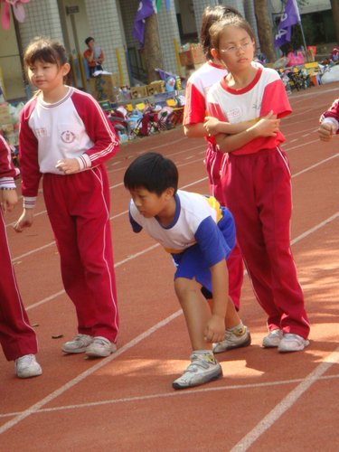 帥酷哥第一項是個人60公尺賽跑輪到帥酷哥比賽時暫時收起笑容準備好比賽姿勢眼睛認真的注視著裁判老師手上的旗子揮下,準備使勁往終點跑