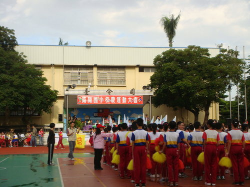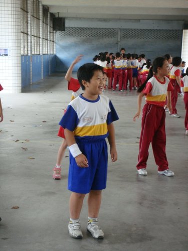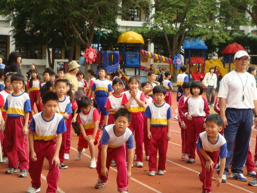 比賽前體育股長帶領大家做運動操,伸展一下筋骨讓等一下比賽大對接力時,骨頭鬆軟才不會運動傷害