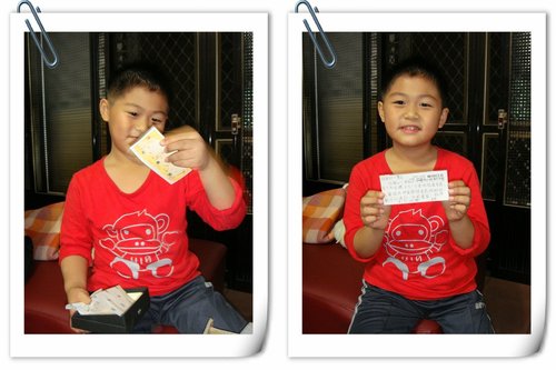 帥酷地看完卡片趕快衝到爸比身邊,抱著爸比說:爸比我好愛你喔! 請你將禮物藏寶圖拿給我啦!