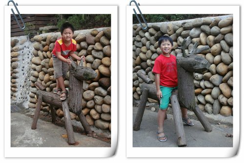 入門票1個人50元可抵餐廳內消費 買完票一走進去在路旁就有這用木頭做的鹿吧! 原本叫兄弟倆坐上拍一張,兩個都沒興趣,有興趣的在後面 這時帥酷爸就衝上前去做下說他們不拍那拍我好啦! 我快速按下快門後就趕緊叫帥酷爸起身離開 因為我看那木頭那麼小一支,我怕會...........................自己想啦!