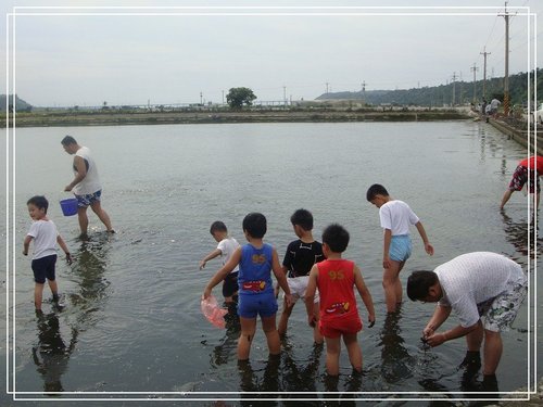 有看到吼!大人小孩都摸的很認真很起勁啦! 我們大嫂團在池上加油吶喊,快摸啊!晚上才可以加菜喔!摸不到就別想加菜啦! 在這時就有一位阿爸摸蜆摸到出聲喽!他說大嫂團們請不要用嘴摸好嗎? 要用嘴摸那就乾脆下來幫忙一起摸晚上加的蜆就會更多啦! 此時在池上的大嫂團們被他這麼一說趕快閉起嘴巴