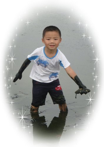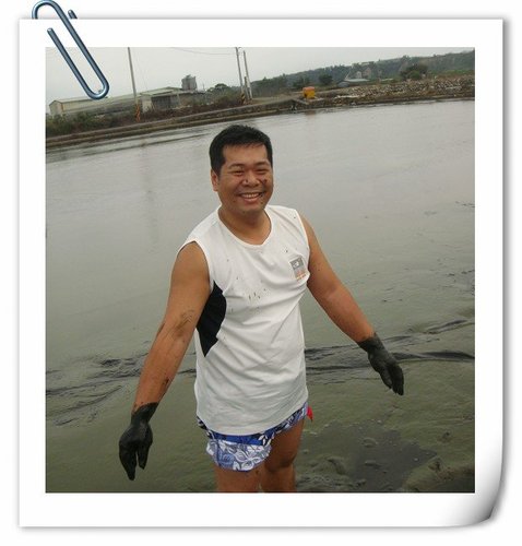 我說帥酷爸我是叫你摸蜆不是叫你玩泥巴ㄟ 你還給我玩到整身整臉的是怎樣啊!衣服不是你在你的吼~ 帥酷爸說冤妄啊!大人,我是摸蜆摸到一尾魚,結果魚一掙脫就把我噴成這樣了啦! 好啦!你理由正當是我冤妄你了,對不起喔!親一個
