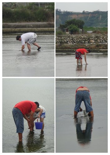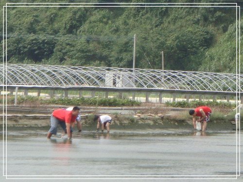 大夥紛紛捲起褲管下蜆池開始摸拉兼洗褲喽! 有看到都是男生嗎?因為大嫂團們再池上用嘴巴摸蜆啦!
