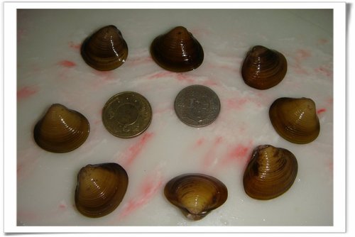 看看這個蜆有沒有給它很大顆啊! 帥酷爸還拿起了50元和10元硬幣起來比一比呢! 真的是大顆喔!都跟50元硬幣一樣大顆了