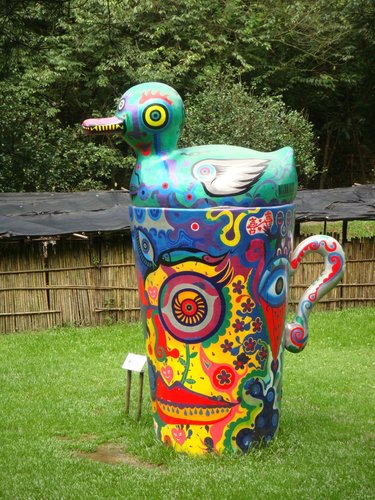 彩繪鮮豔的大杯子上還坐著一隻同樣彩繪鮮豔又特別的鴨子造景 鮮豔的色彩促立在綠油油的草皮上,感覺特別的醒目