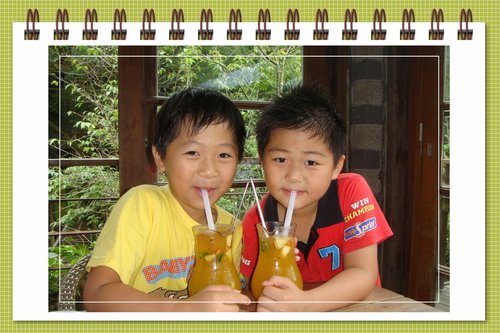 帥酷媽也幫帥酷兄弟留下一張兄弟倆喝著甜蜜蜜水果茶的開心笑容