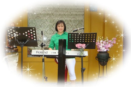 餐廳外歌手專用電子鋼琴 帥酷媽調皮的坐上去拍一下啦!